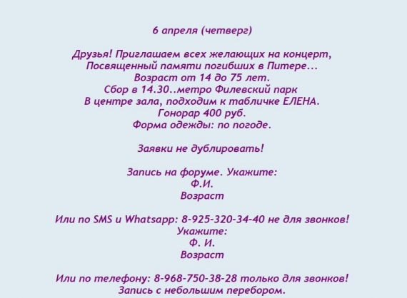 У Москві оголосили набір масовки на концерт пам'яті загиблих у теракті в Санкт-Петербурзі. За участь обіцяють заплатити 400 руб. (майже 200 грн).