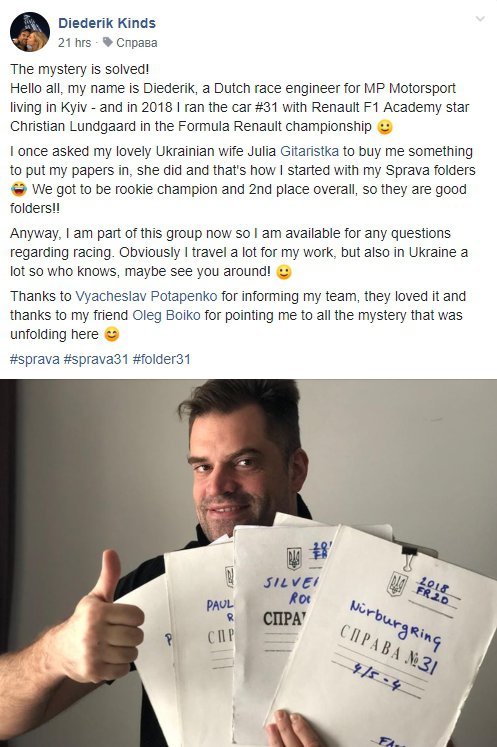 Користувачі соцмереж під час трансляції гонок Formula Renault Eurocup в Монако помітили в руках у інженера картонну папку з написом "Справа №31" українською мовою.