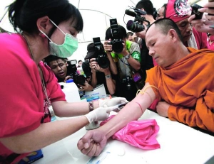 Буддійський ченець у Таїланді здає кров для акції протесту. У кожного учасника забирали по 200 міліметрів