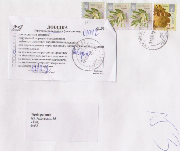 Яким було моє здивування, коли лист, адресований Партії регіонів, за кілька днів повернувся назад з поміткою "за зазначеною адресою не проживає"!