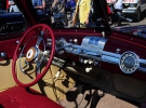 Бордово-кремовый кабриолет имеет массивные передние крылья и оригинальную эмблему на хромированной решетке радиатора. Запасные колеса стоят в специальных нишах правого и левого передних крыльев. Лобовое стекло переделено на две части. Оно, как и боковые окна, украшенное хромированным ободком.