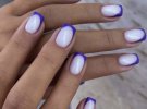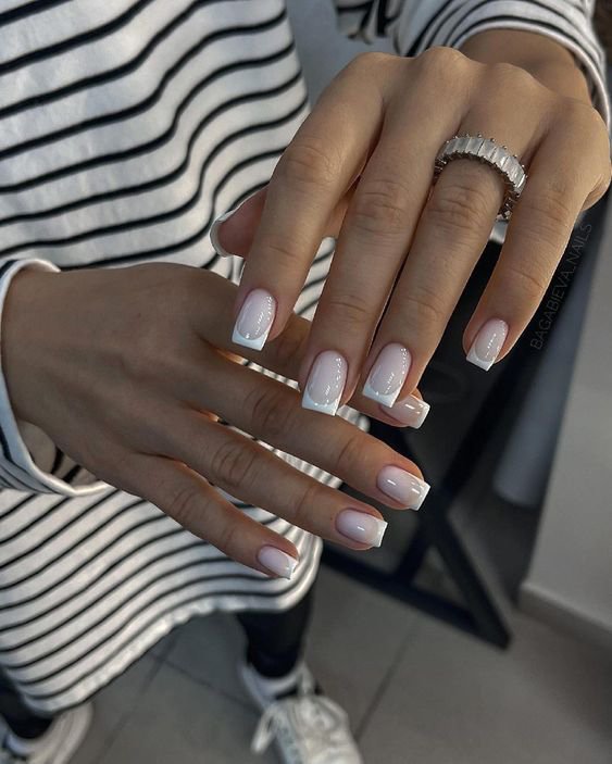 Край ногтя покрывают белым цветом, а за основу берут светлый оттенок.