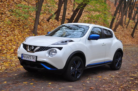 Белый с синими элементами "Ниссан Джук" берем на тест-драйв в автосалоне на столичной ул. Корабельной. Это переднеприводная версия в комплектации "Текна" стоимостью от 641 710 грн. Авто оснащено 1,6-литровым атмосферным двигателем на 117 л.с. и коробкой передач-вариатором.