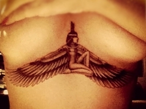 В память о бабушке 24-летняя обладательница Grammy сделала себе экстравагантную татуировку во всю грудь. Певица набила изображение древнеегипетской богини Изиды, олицетворяющей женственность и материнскую заботу.