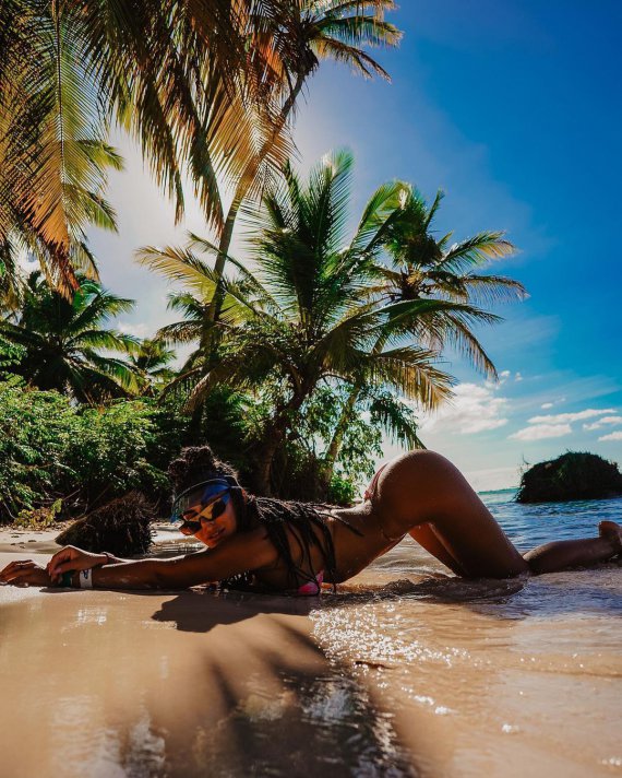 Звезда сети устраивает горячие фотосессии на пляже в Доминикане, куда отправилась вместе с тремя детьми и подругой. На снимках позирует в микро-бикини. Кадрами делится в своем Instagram-блоге.