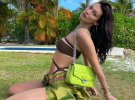Французская модель 23-летняя Тина Кунаки соблазняет своих поклонников снимком в зеленом бикини. Фасон интересный вшитыми кольцами и цепочкой. Также такая модель купальника способствует равномерной загару, ведь бюстгальтер без бретелек.