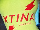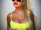 Агилера выгибалась в желтом монокини со своим логотипом, под который надела черные туфли-лодочки на шпильке.