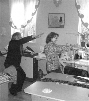 Владелица черкасского ателье ”Лилу” Елена Луценко (в центре) вместе с работницами делает гимнастику в цехе. Женщины считают, что при сидячей работе не помешает заниматься физическими упражнениями даже дважды в день