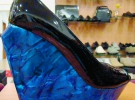 Черные лакированные туфли на синей платформе. Материал — кожа, подошва — пластик с перламутром и лаком. Цена — 5270 грн. Производитель — Франция.