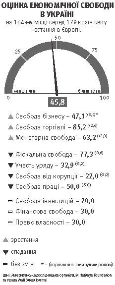 — Оценка экономических свобод содержит не только анализ объективных показателей, но и субъективное видение событий в Украине, — говорит директор Центра антикризисных исследований, экономист Ярослав Жалило, 42 года. - Отрицательный имидж нашей экономики нагромождался на протяжении многих лет. Первый параметр экономической несвободы - политически-фискальный. У нас перегруженная налоговая система, слишком много вмешательства государства в бизнес. Второй показатель - распространение коррупции. Она возрастает на снижении дееспособности государства в последние три года. Попытки освободиться от раздутого чиновничьего аппарата сейчас неэффективные. Третий фактор - низкие возможности ведения бизнеса. В Украине узкий внутренний рынок, недостаток кредитных ресурсов, проблемы с открытием собственного дела и привлечением эффективного персонала. Реализовать полностью свои намерения предприниматель просто не имеет возможности, а отсюда и результат - экономика не эффективная.