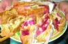 "Я смазываю форму для выпечки любым жиром, - рассказывает Юля. - Но лучше, конечно, маслом, тогда пирог будет ароматным. Большую часть теста растягиваю на противень, по периметру делаю из теста небольшие бортики, чтобы творожная масса не вытекала. На тесто выкладываем начинку из творога, не разглаживаю ее, просто стараюсь сделать так, чтобы было равномерно по всему пирогу. Далее из оставшегося теста делаю восемь полосок, которые выкладываю на сыр, делая между полосками одинаковые промежутки. Промежутки заполняю фруктами ".