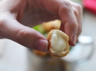 В каждую фрикадельку осторожно положить по шарику моцареллы, так, чтобы фарш полностью их покрывал.