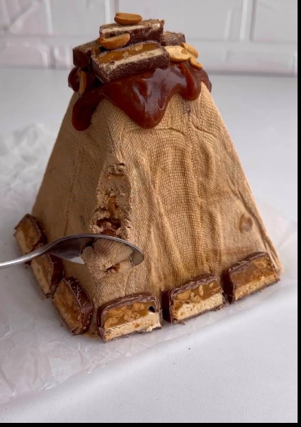 Добавляем карамель с арахисом, шоколадную начинку и перемешиваем лопаткой буквально несколько раз, чтобы получился хороший мраморный узор.