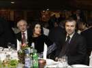 На третий этаж, где для гостей накрыты столы, мэр не поднимается. Там начинают праздничный концерт — поет львовская группа "Пиккардийская терция", колядует детский этнографический театр "Левеня". Колядники ходят между столами, собирают деньги в плетеные шляпы. Им бросают в основном по 10 и 20 грн. Потом дети начинают бегать по залу.