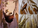 Любимая тема для объемных картин Аннемиеке Мейн это природа. Художницу интересует флора и фауна, в частности, насекомые и птицы, по которым она любит наблюдать. Она сначала изучает их поведение и привычки в различных ситуациях, рассматривает картинки в книгах по биологии и зоологии, а затем с научной точностью воспроизводит в эскизах то, что увидела, и переносит это на ткань.