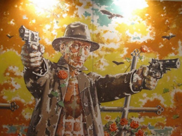 Василий Цаголов - киевский художник, хорошо известный за рубежом. Он активно реагирует на многие тенденции в обществе и искусстве. Не обошл он вниманием и Херста, как одного из самых известных, коммерчески успешных художников мира. Основная тематика творчества Херста - смерть, заявка на ее философско-религиозное осмысление. Цаголов тонко, иронично обыгрывает этот момент в картине "Кого боится Херст". В 2009 году в PinchukArtCentrtе проходила выставка Дэмиена Херста. Одновременно с ней Василий Цаголов в киевской галерее "Коллекция" выставил эту свою картину. На полотне ковбой с пистолетами в обеих руках, идет вперед, стреляя направо и налево, оставляя после себя кладбищенские кресты. Образ ганстера, что занимает все пространство картины, написанный с нижнего ракурса, настолько довлеет над зрителем, что воспринимается как аллегория коммерческого искусства, навязывает нам свои вкусы, образ мышления и стиль жизни. Работу приобрел украинский коллекционер.