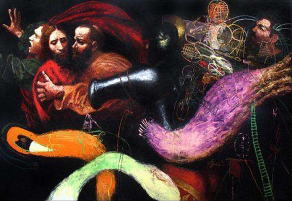 Одессит Александр Ройтбурд один из основателей украинского постмодернизма. Его работы экспонируются в нью-йоркском Музее современного искусства. "Прощай, Караваджо" была продана в 2009 году. Картина была написана под впечатлением похищения из одесского Музея западного и восточного искусства знаменитого полотна Караваджо "Поцелуй Иуды, или Взятие Христа под стражу". Полотно стало началом серии монументальных работ "Ройтбурд vs Караваждо". Одноименная выставка проходила в апреле-мае 2010 года в киевской галерее "Коллекция". По мнению художника, подобная игра с шедеврами классики помогает раскрыть в них новое значение.