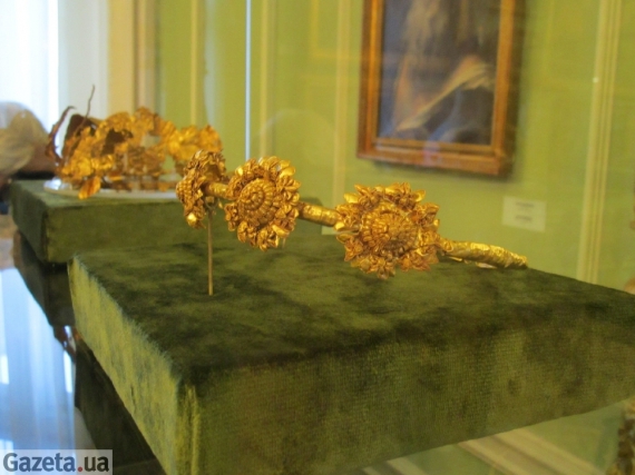 "Эти изделия - с настоящего античного золота без примесей. Венки носили настоящие скифы - мужчины. Чем выше положение в обществе занимал человек - тем дороже была его диадема. Венки - это древняя традиция трипольцев, греков, римлян", - рассказала директор Львовского Дворца Потоцких Оксана Козинкевич.