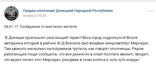 "В Донецке произошел ужасный теракт! Весь город содрогнулся! Возле авторынка в районе ж/д вокзала взорван микроавтобус Меrcedes. Взорвалось несколько килограммов тротила, как говорят ополченцы. Рядом работают люди, которые сообщили, что все разнесло в хлам! Коллега звонил, говорит, что лично видел этот Меrcedes, разорванный в хлам, колеса и немного морды", - написал дончанин на одном из пророссийских сайтов.