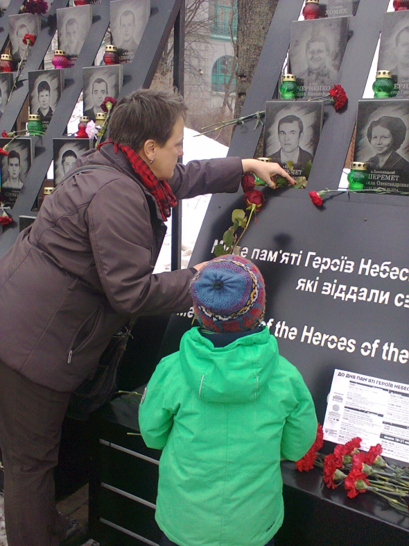 - Они погибли, чтобы нам было хорошо жить, - 51-летняя Анита Сигида помогает 6-летнему сыну положить две красные гвоздики к стеле с именами погибших. В Киев они приехали из Запорожья. - Я была только на первом вече. А так носила ребятам всякие вкусности, деньги давала. Революция помогла мне понять, что я украинка. Когда Ющенко начал украинизацию, я не восприняла этого, даже протестировала. После Майдана мы в семье перешли на украинский язык. Сейчас смотрим украинские мультики, фильмы с украинским дубляжом. В этом году ребенок пойдет в украиноязычную гимназию.