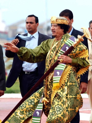 Муаммара Каддафі називають наймоднішим диктатором. Вбрання використовує для наголошення бедуїнського походження. Під час першого за 40 років візиту до Рима Каддафі одягнув військову форму з масивними золотими еполетами. На грудях у червоній рамці почепив фото лівійського героя Омара Мухтара. Вождь бедуїнів Мухтар боровся проти італійських окупантів, які стратили його 1931-го. На зустріч із прем'єром Португалії у каїрському готелі Shelton у квітні 2000 року Каддафі прийшов у рожевому атласному балахоні. Про його вбрання написали в новинах: "Напевне він загубив багаж і скомбінував костюм із готельних штор і покривал".