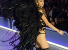 Выход супермодели Джиджи Хадид был одним из ожидаемым среди зрителей. Один из образов звезды состоял из черного комплекта кружевного белья, украшенной лентами из бархата. Создавался эффект сетки из геометрических форм. За спиной Хадид красовались роскошные черные крылья. Внезапно одна из полосок оборвалась и повисла.