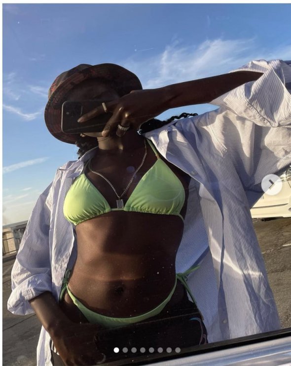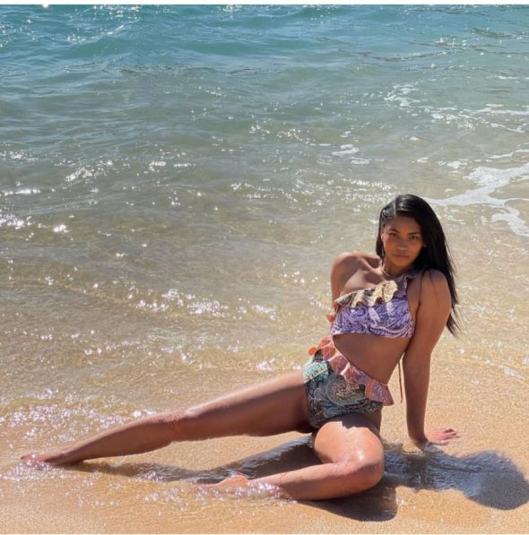 Неопринт. Топ-модель Шанель Ньясиасе выбрала бикини в обновленной ультрамодной версии с теплым принтом и яркими цветами, дополнив образ украшениями.