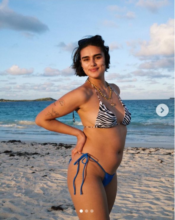 Купальник teddy из махровой ткани пришел с 1980-х. Мода тех времен актуальна и в купальниках также проявляется. Хейли Бибер выбрала купальник цвета щербета и дополнила нежным украшением тела.