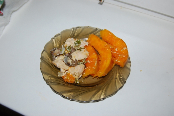 -?Англичане всыпают столовую ложку орегано. Не люблю его. Режу петрушку и заливаю полстакана сливок. Тру 100 граммов пармезана или голландского сыра. Накрываю тыквенной крышкой. Чтобы не пригорела и кожица была красивая, обмазываю подсолнечным маслом. Пеку при 180 градусах час-два - зависит от сорта. Тыква готова, если нож прокалывает кожицу. Кладу курицу на тарелку и поливаю соусом. Тыкву режу ломтями, досаливаю и подаю как гарнир.