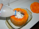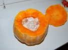 1. Тыкву легче чистить, если проколоть ножом корку в нескольких местах и положить на 2 мин. в микроволновку. Разрезают поперек, кладут срезом на доску. Снимают верх и обчищают ножом полосками сверху вниз.