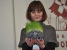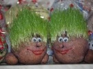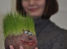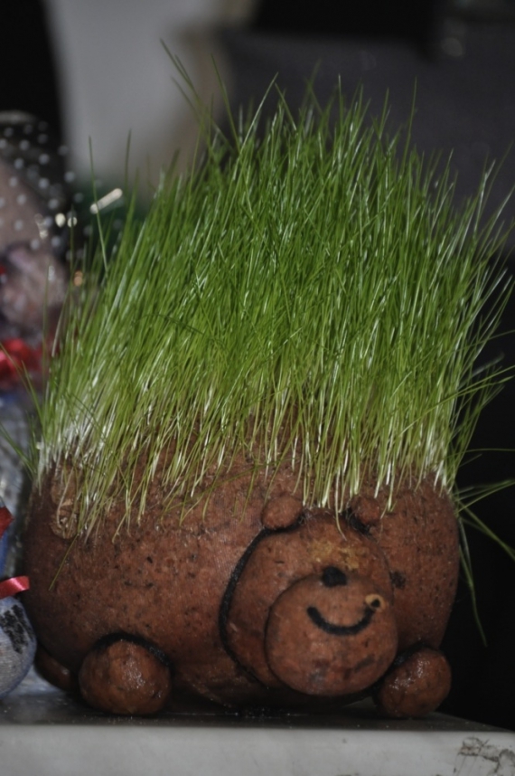"Ці іграшки називаються трав'янчиками. У тирсу, з якої вони зроблені, я посіяла зерна трави "Рейграс". За два тижні вони проростають — і у іграшки з'являється пишний чуб."