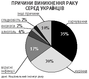 В Украине треть всех онкологических болезней провоцирует питание. Поэтому больше всего больных с раком толстой кишки. Курение поражает не только легкие и бронхи, но и желудок, печень, почки, мочевой пузырь. Женщины от курения рискуют иметь рак шейки матки.