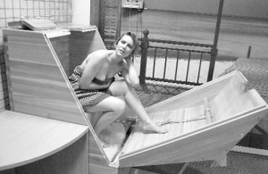 Приглашает в фи тосауну. Наталия раздевается, закутывается в полотенце. Садится на скамью в бочке и закрывает дверцу. Видно только ее голову. К уху цепляют клипсу, которая фиксирует количество ударов сердца в минуту и потерянные килокалории.