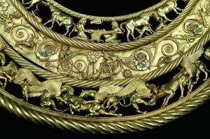 Скифы считали золото признаком власти и благосостояния. Чем его было больше - тем лучше. Царь носил пектораль на шее поверх одежды. Скифы любили одежду красного и синего цветов, усыпанную золотыми бляшками и пластинами. Драгоценность удачно дополняла образ обладателя.