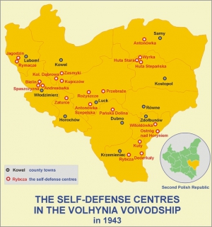 Впрочем, в течение 1943 местные поляки были стороной оборонявшейся. В конце года силы УПА, вероятно, достигли 15-20 тысяч бойцов. К тому же, антипольские действия УПА поддерживали местные украинцы, а это около 80% общего населения Волыни, тогда как поляков было до 16%, а до 1943 г. их представительство уменьшилось еще где-то до 8% (200 тыс.). Однако, по данным Волынского командования АК, польские партизанские отделы насчитывали только около 1300 воинов. Еще примерно 3600 человек, которые имели хоть какое-то оружие, действовали в базах самообороны. Этим можно объяснить и разницу в количестве жертв противостояния на Волыни. С украинской стороны - несколько тысяч, с польской - несколько десятков тысяч.