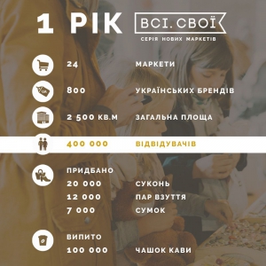 "За первый год нас посетили больше 400 000 гостей, ― рассказывает организатор маркета Анна Луковкина. ― Мы объединили производителей из Киева, Одессы, Харькова, Днепропетровска, Львова, Винницы, Житомира, Запорожья, Тернополя. И их товары нашли своего покупателя: за год украинцы на "Всі. Свої" купили 20 000 платьев, 12 000 пар обуви, 7 000 сумок. А уже 14-15 мая эти цифры станут еще больше".