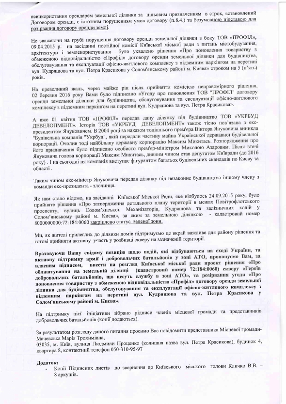 В обращении к мэру Кличко киевляне отмечают, что в прошлом году участок на пересечении улиц Кудряшова и Красикова был признан "зеленой зоной", а потому любое строительство на ней просто невозможно. Инициативная группа обратилась к Виталию Кличко с призывом разорвать соглашение о предоставлении земли "Профилу" и обустроить на этом участке сквер "Героев добровольческих батальонов, несущих службу в зоне АТО". "Мы не хотим верить, что мэр столицы мог сознательно пойти на сделку с соратниками Януковича. Ждем скорейшей поддержки мэром столицы нашей инициативы", - заявляют жители Соломенки.