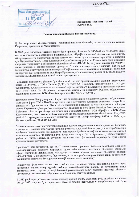 Как отмечено в обращении жителей, этот участок еще в 2007 году был передан в аренду сроком на 5 лет ООО "Профиль", которое определило подрядчиком фирму одиозного министра образования Януковича Дмитрия Табачника и его брата Михаила. Как известно, 7 июля 2015 МВД объявило в розыск Дмитрия Табачника, который подозревается в совершении преступления, предусмотренного ч. 5 ст. 191 Уголовного кодекса (присвоение, растрата или завладение имуществом путем злоупотребления служебным положением).