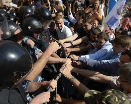 Пикетчики под Киевсоветом заблокировали движение на улице Крещатик - заблокировали 4 полосы в сторону Бессарабской площади и одну в сторону Европейской. Пытаются металлические ограждения вытащить на дорогу, однако милиционеры препятствуют им.