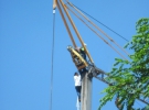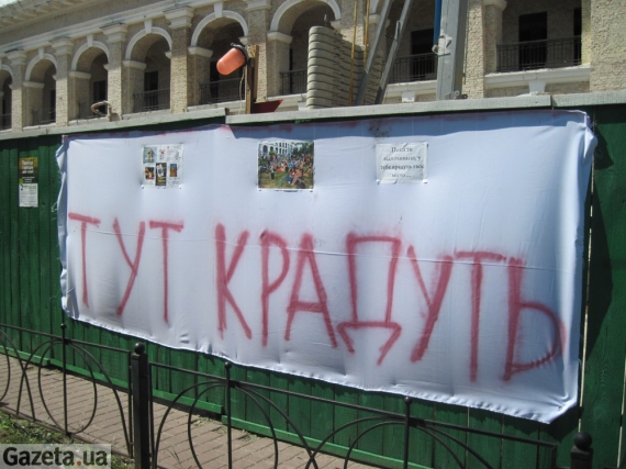 Игорь Луценко и Марина Лебедева разместились на стреле подъемника, а Татьяна Чорновол все время просидела в альпинистском снаряжении на лестнице. Активисты попытались вывесить плакат "Здесь воруют", но он упал.