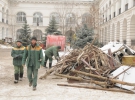 Молодой милиционер разговаривает с рабочими, что-то записывает себе в блокнот. Отказывается комментировать: "Мы на охране общественного труда. Вы нас еще фотографируете - ну что вы за люди? Я тоже на работе. Охраняю общественный порядок: чтобы активисты не подрались с рабочими".
