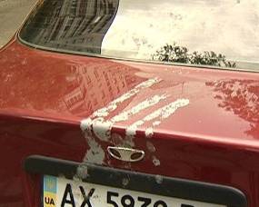 По его словам, теперь придется полностью перекрашивать левую переднюю дверь, заднее левое крыло, капот и крышу, кислотой поврежден также бампер и фара. Стоимость покраски владелец автомобиля оценил в 5-6 тысяч гривен.