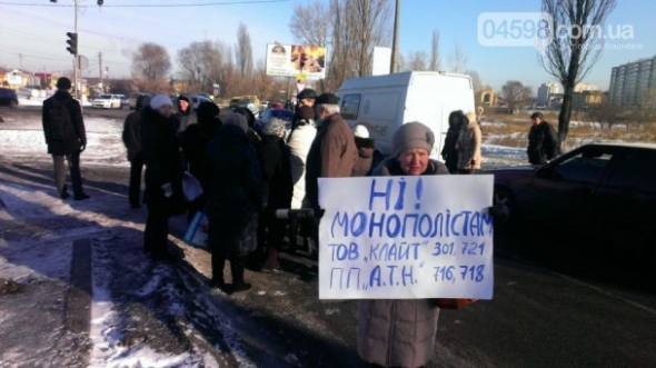 Протестующие непрерывно переходят дорогу, не пуская маршрутки в Киев. Они держат плакаты: "Нет монополистам". Призывают услышать их требования и снизить цены на проезд.