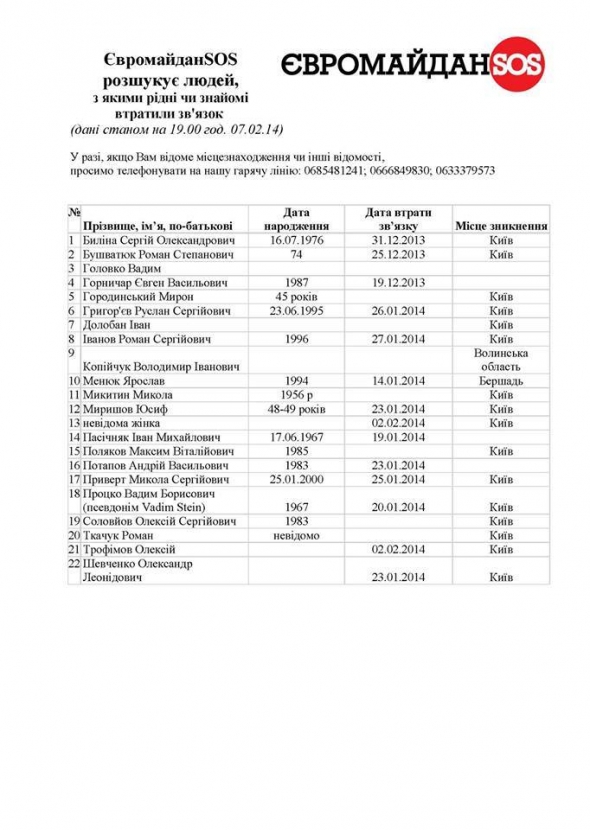 "По состоянию на 19:00 7 февраля Евромайдан SOS имеет информацию о 22 лицах, с которыми родные или знакомые потеряли связь", - говорится в сообщении.