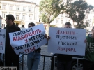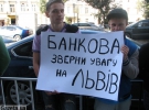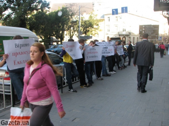 В руках активисты держали плакаты: "Данилова в суд", "Каблак не дай волю рейдерам", "Долой рейдеров в мантиях", "Банковая, обрати внимание на Львов", "Данилов - Пустомытовский Зварыч", "Сегодня отбирают у кого-то, завтра придут к тебе ", "Нет судейскому произволу".
