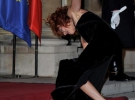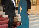 Карла выбрала изумрудно-зеленое длинное закрытое платье от Roland Mouret. При этом наряд был настолько облегающим, что подчеркивал все изгибы фигуры, и к тому же было явно видно: госпожа Бруни-Саркози не надела бюстгальтер. По виду Николя Саркози можно предположить, что он гордится идеальными формами супруги.