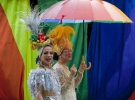 Несмотря на небольшой дождь, сторонники геев, лесбиянок, бисексуалов и трансгендерных лиц буквально полностью заполнили главную улицу города, танцуя на грузовиках под звуки зажигательной музыки.