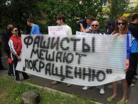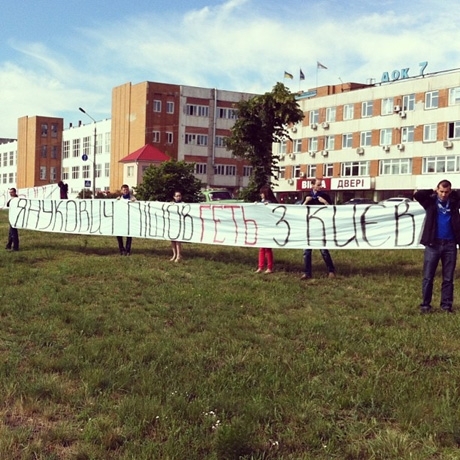 Несколько десятков активистов устроили пикет перед входом в футбольный центр "Барса", куда приехал Янукович. У "Барсы" ждали президента и два десятка участников так называемого антифашистского марша с большим плакатом "Фашисты мешают "покращенню". Среди участников марша были представители сразу нескольких оппозиционных партий. Они расположились через дорогу от "Барсы". Затем в центр стали подвозить на автобусах граждан с приколотыми сине-желтыми лентами. Среди привезенных преобладали молодые люди, судя по всему учащиеся ПТУ или техникумов. Их построили, наглухо закрыв оппозиционеров.