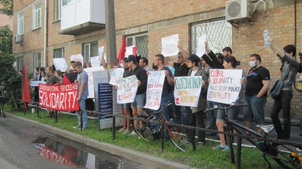 Всего собралось около 60 человек, из них более десятка - представители турецкой диаспоры. Активисты держали в руках лозунги на украинском, русском и турецком языках "Черное море - не помеха для солидарности", "Сегодня Таксим - завтра Контрактовая", "Остановите насилие", "Глобальная солидарность остановит полицейский грубость".