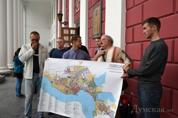 Представители инициативной группы одесситов - активисты и руководители ряда общественных организаций - торжественно разорвали главный чертеж "градостроительной конституции" у главного входа в муниципалитет.